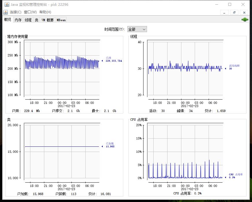 连接进去之后,就可以看到jconsole概览图和主要的功能:概述、内存、线程、类、VM、MBeans