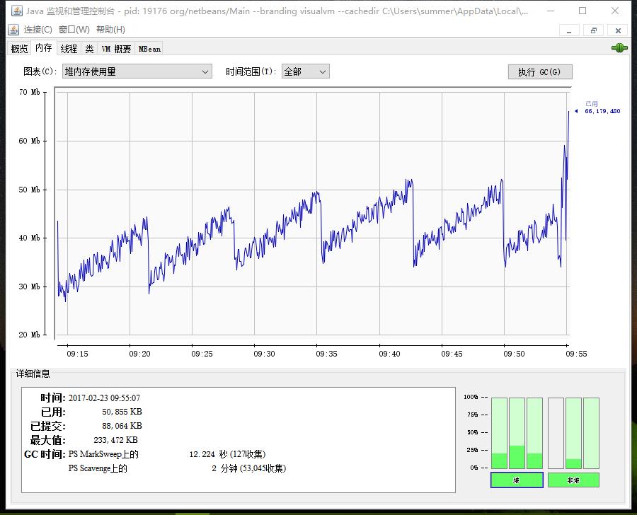 Visual GC 是常常使用的一个功能,可以明显的看到年轻代、老年代的内存变化,以及gc频率、gc的时间等。