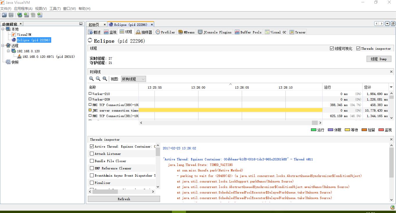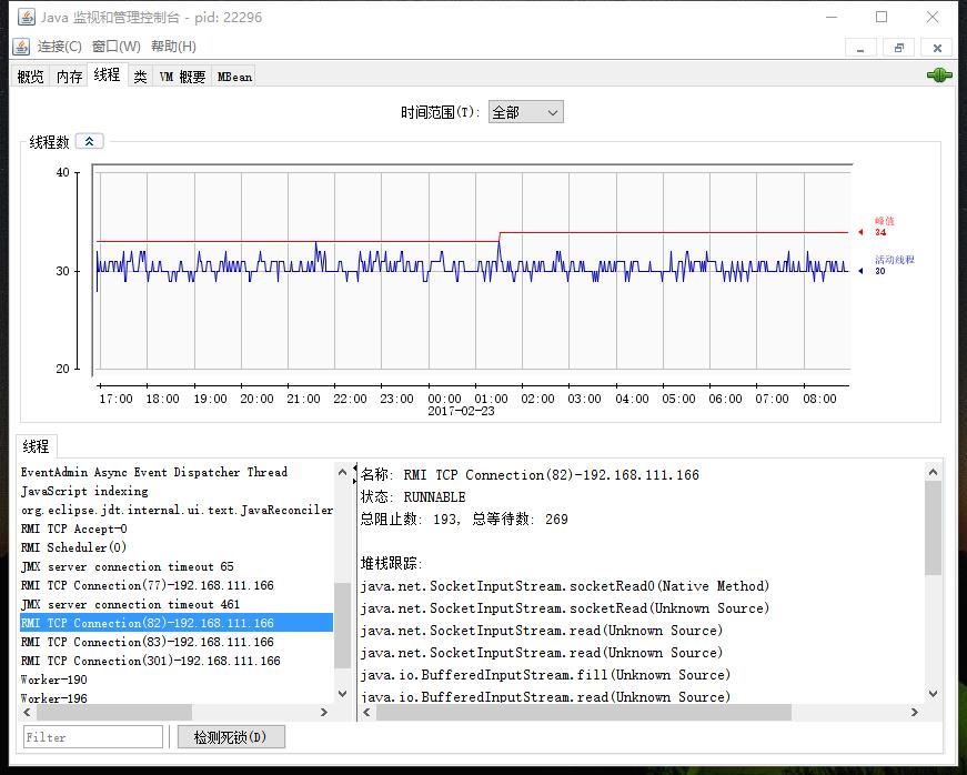 线程,主界面展示线程数的活动数和峰值,同时点击左下方线程可以查看线程的详细信息,比如线程的状态是什么,堆栈内容等,同时也可以点击“检测死锁”来检查线程之间是否有死锁的情况。