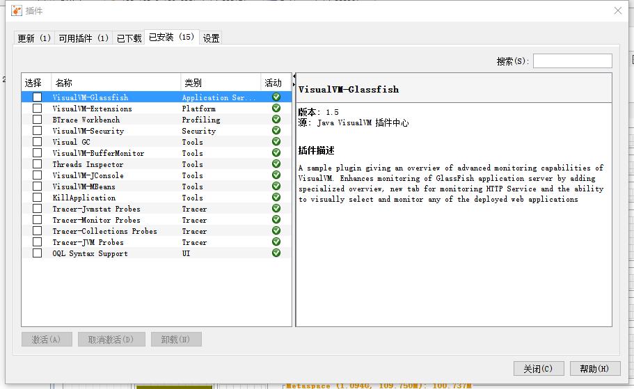 VisualVM可以根据需要安装不同的插件,每个插件的关注点都不同,有的主要监控GC,有的主要监控内存,有的监控线程等。