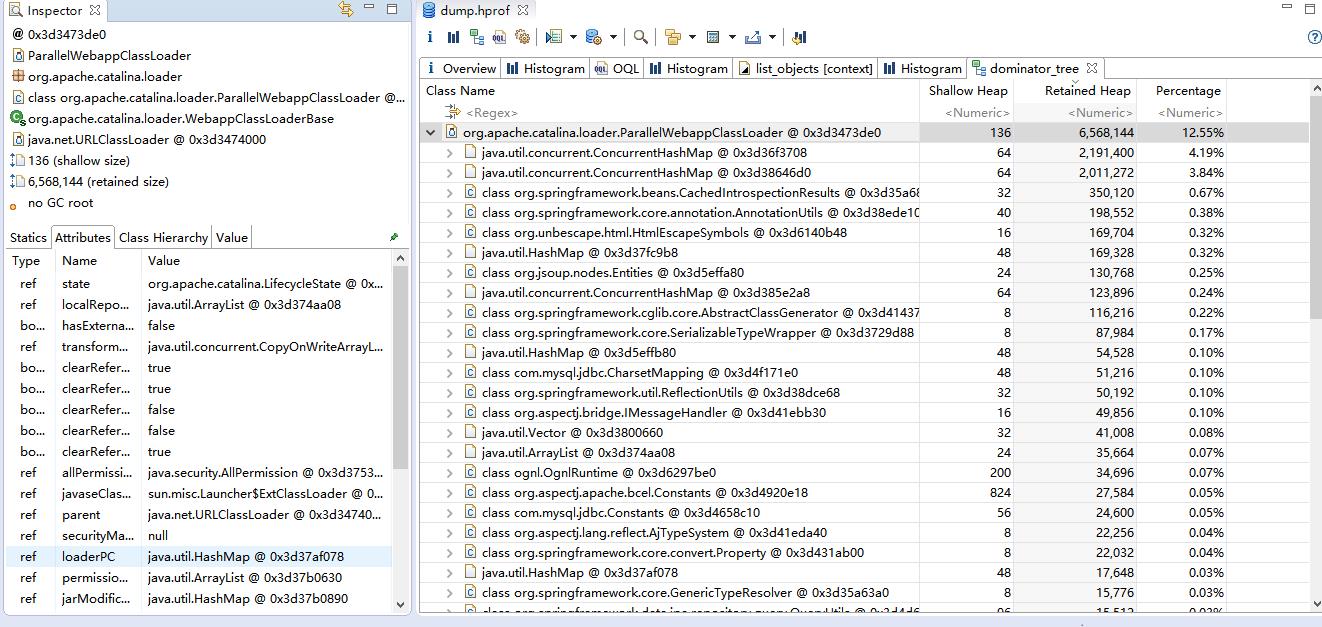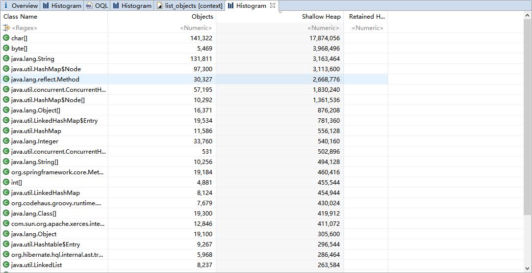 Histogram:列出内存中的对象,对象的个数以及大小,支持正则表达式查找,也可以计算出该类所有对象的retained size