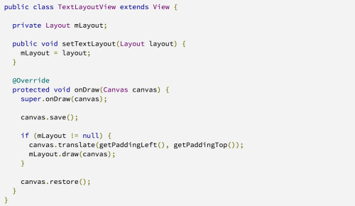 使用自定义的view来手动绘制text.Layout会提升其性能:TextView是一个包含大量特性的通用控件。如果我们只需要在屏幕上渲染静态的,可点击的文本,事情就简单多了: