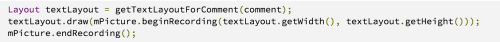 由于text.Layout需要在构造函数中测量文本的高度,因此它的创建效率不高。缓存text.Layout和复用text.Layout实例可以节省这部分时间。Android的TextView控件并没有提供设置TextLayout的方法,但是添加一个这样的方法并不困难: