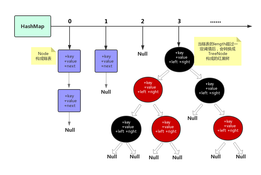 2、对扩容进行了优化,引入红黑树,提高了查找元素位置的效率,特别是在数据量较大,hash冲突较多时;