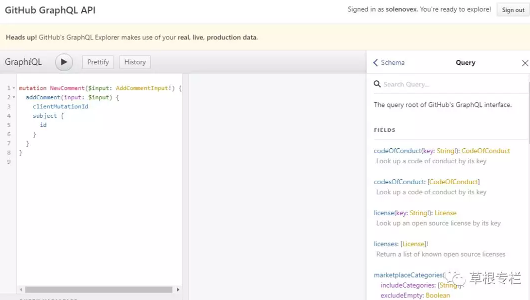内省(Introspection)。像REST,就需要安装Swagger等工具来帮助浏览API。而GraphQL本身就具备可发现性。它还带有一个浏览器内的IDE用来浏览GraphQL API。下图就是Github的GraphQL API: