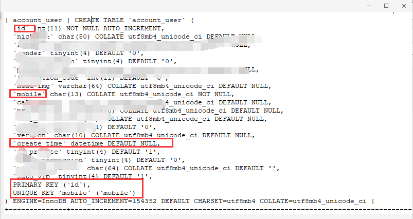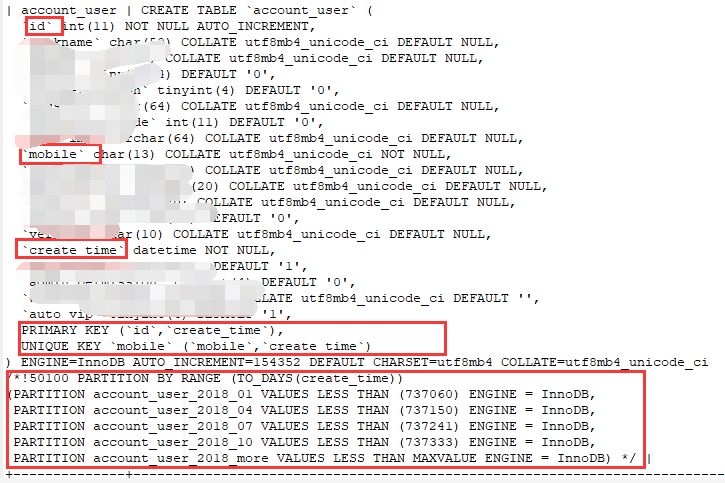 通过如下命令进行操作把 create_time分别放在主键和unique键中(这时mobile字段不能保证唯一性,这是个大问题,需要解决)