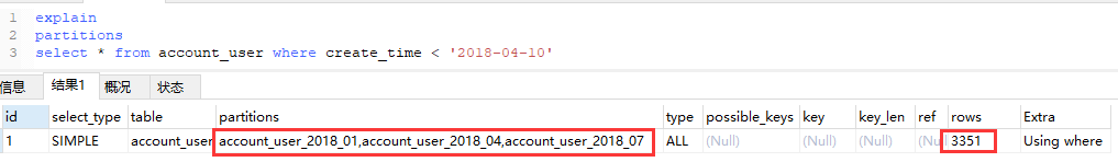 只是查询了 3351行,或者说是查询了 (account_user_2018_01,account_user_2018_04,account_user_2018_07)三个分区