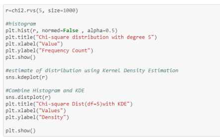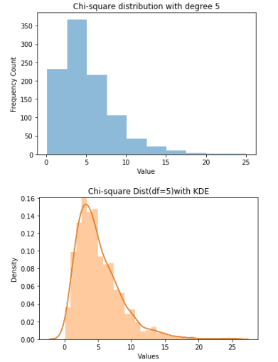 We will graph a Chi-square distribution with degree 5 and size 1000, and use Kernel Density Estimation to fit the graph. We can see this is a pretty good fit.