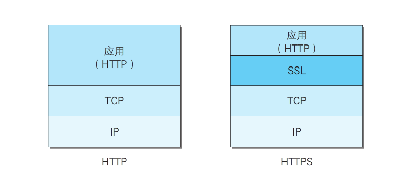 在使用http协议时,HTTP直接与TCP通信,当使用SSL时,则需要先与SSL通信,然后再由SSL和TCP通信。