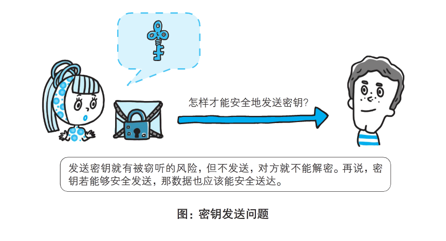 也就是说在加密的同时,也会把密钥发送给对方。在发送密钥过程中可能会造成密钥被窃取,那么如何解决这一问题呢?这个问题解决方案,往后看