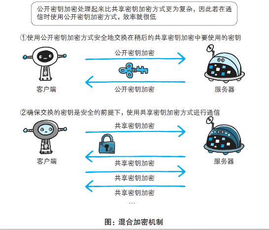 HTTPS采用共享密钥加密和公开密钥加密两者混合加密,两者都有各自的优点。共享密钥加密处理速度快,但密钥无法安全发送给对方;公开密钥加密处理速度慢,但密钥能够安全交换。