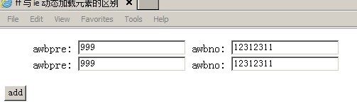 代码本意为:点击Add按钮时,动态向页面添加二个输入框,同时给二个新加的输入框赋值。IE 6,7,8,9(兼容模式)下运行正常,见下面的截图: