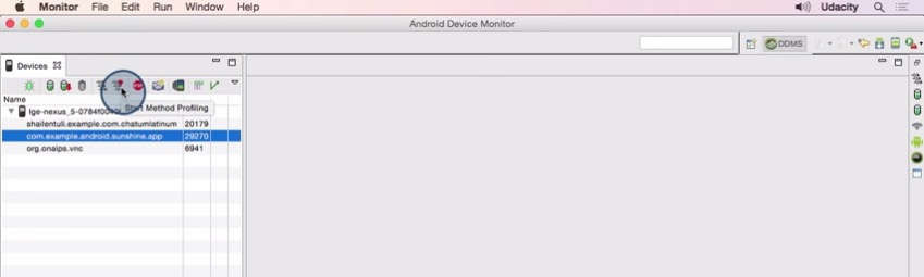 通过Android Studio打开里面的Android Device Monitor,切换到DDMS窗口,点击左边栏上面想要跟踪的进程,再点击上面的Start Method Tracing的按钮,如下图所示: