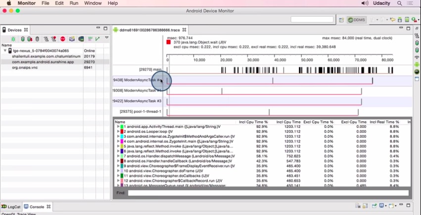 启动跟踪之后,再操控app,做一些你想要跟踪的事件,例如滑动listview,点击某些视图进入另外一个页面等等。操作完之后,回到Android Device Monitor,再次点击Method Tracing的按钮停止跟踪。此时工具会为刚才的操作生成TraceView的详细视图。