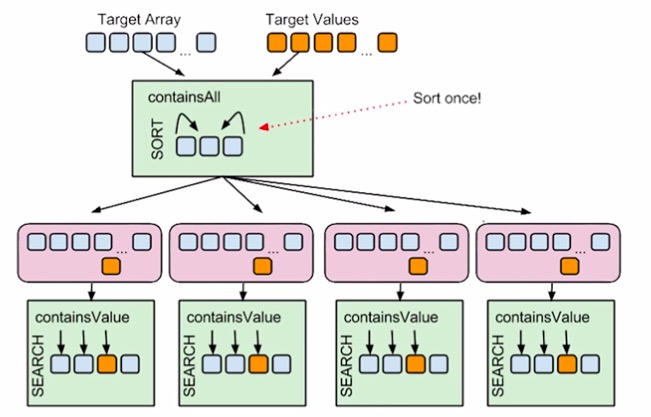 Batching是在真正执行运算操作之前对数据进行批量预处理,例如你需要有这样一个方法,它的作用是查找某个值是否存在与于一堆数据中。假设一个前提,我们会先对数据做排序,然后使用二分查找法来判断值是否存在。我们先看第一种情况,下图中存在着多次重复的排序操作。