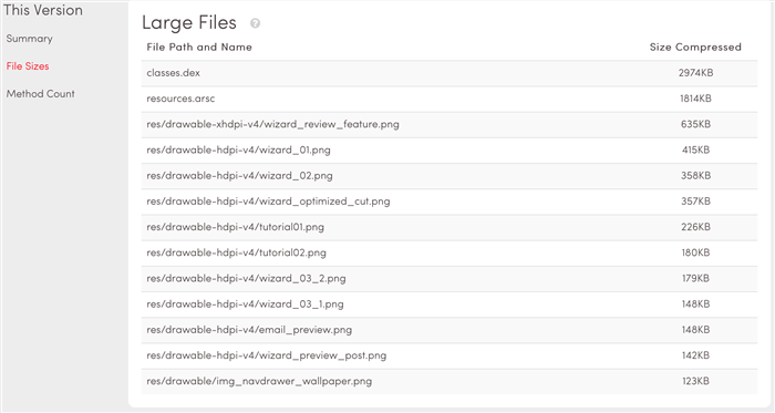 NimbleDroid 是美国哥伦比亚大学的博士创业团队研发出来的分析Android app性能指标的系统,分析的方式有静态和动态两种方式,其中静态分析可以分析出APK安装包中大文件排行榜,各种知名SDK的大小以及占代码整体的比例,各种类型文件的大小以及占排行,各种知名SDK的方法数以及占所有dex中方法数的比例,废话不多说,下面上高清无码大图看看颜值吧。