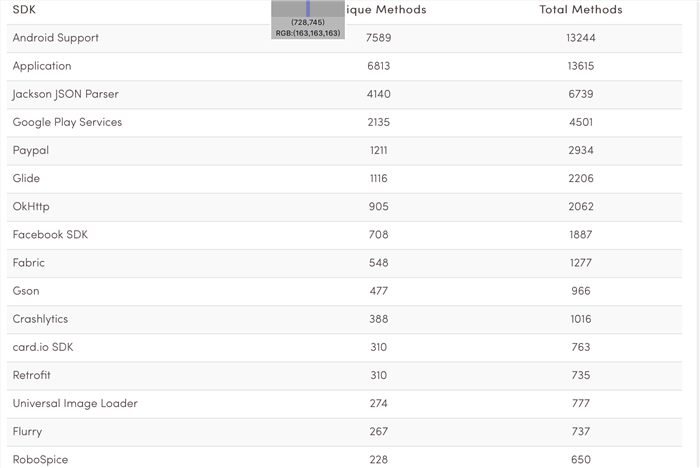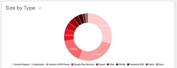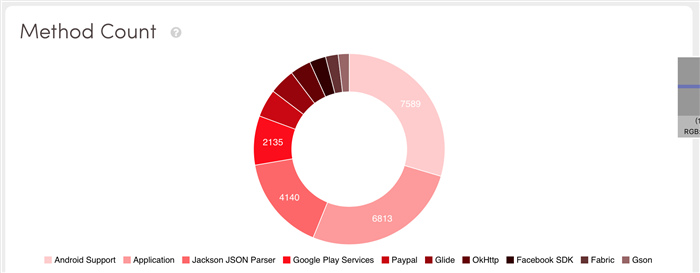 各种知名SDK的大小以及占代码整体的比例,这里目前能识别出Android Support,Jackson JSON parser, Google Play Services, Paypal, Glide, OkHttp, Facebook SDK, Fabric, Gson等等,Application表示App中自己编写的代码部分