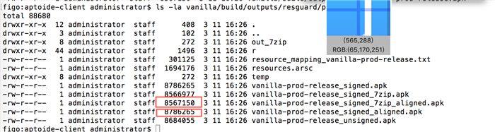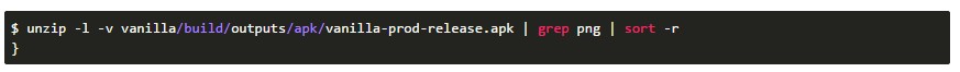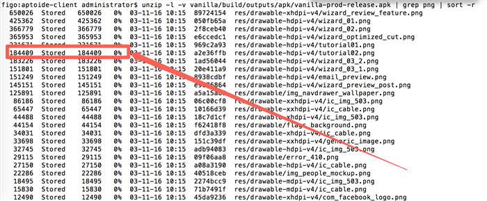 这看起来有点不合理,png原封不动的放入zip,当然最后产出的apk会比较大。那么,如何解决呢?笔者首先尝使用android gradle plugin的方式,发现aaptOptions和packagingOptions都未能解决问题。在github上发现一个开源项目AndResGuard,试了集成到项目中,再看结果如下: