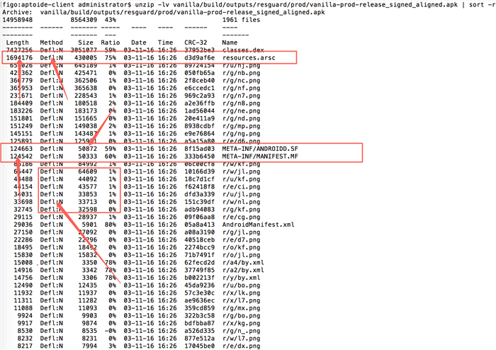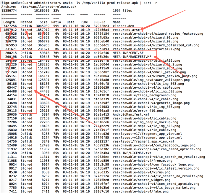 3. 意外发现resources.arsc, META-INF/*.SF 以及 META-INF/*.MF变小了,而且是解压之后的文件大小也变小了。