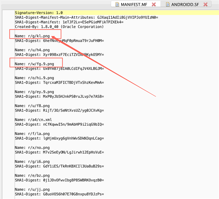 原来apk中资源(png, xml,以及properties文件)的相对路径会存放到META-INF/*.SF 以及 META-INF/*.MF中并为每个资源文件计算SHA1值并存储在这两个文件中,至于为啥这么做以及这两个SHA1有啥区别和作用请参考网络上关于这方面知识的文章,已超出本文的主题所以这里不再赘述。