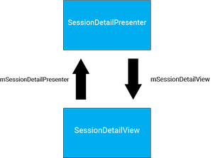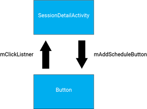 });SessionDetailActivity 持有对 mAddScheduleButton 的引用,而且 mAddScheduleButton 也持有对 SessionDetailActivity 的引用。我等会会说,这样的循环依赖限制我们通常用于 Activities 中实现 UI 相关的业务逻辑的方法。