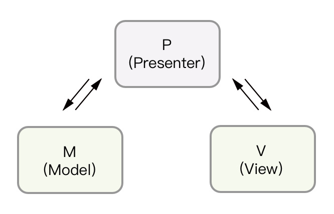 MVP 即 Model – Presenter – View,各部分之间的通讯,都是双向的,Presenter 持有 View 和 Model 的抽象引用,作为中间人,处理业务逻辑,Model 角色用于调取数据,而 View 则用于展现和控制 UI,它们都由中间人 P 调度。抽象的好处前面说了,如果 M 或 V 有改变,只要换一个实现者就好了,对于 P,可以继续把它们当成提供一样的可调用方法对象。