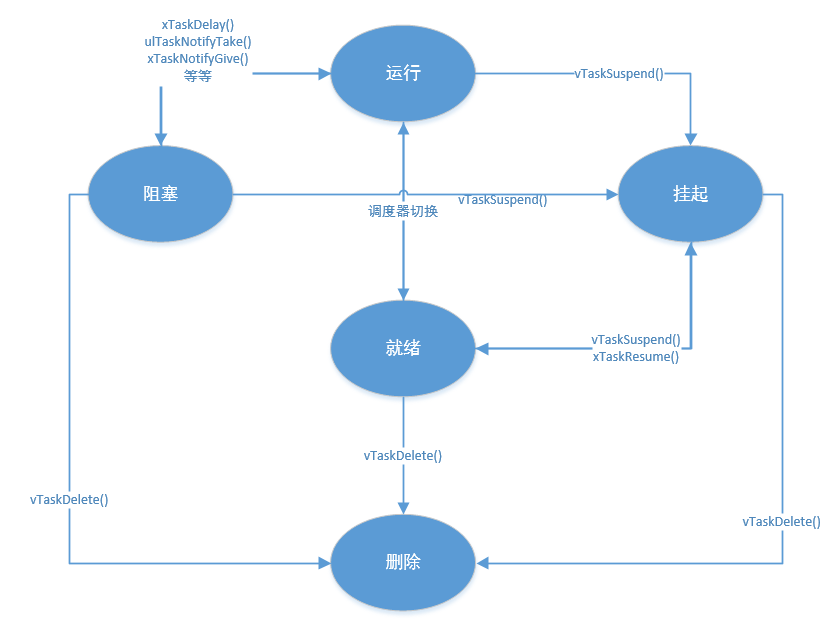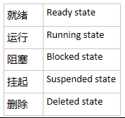 删除状态:一个任务被使用vTaskDelete()函数后被删除,处于删除状态。