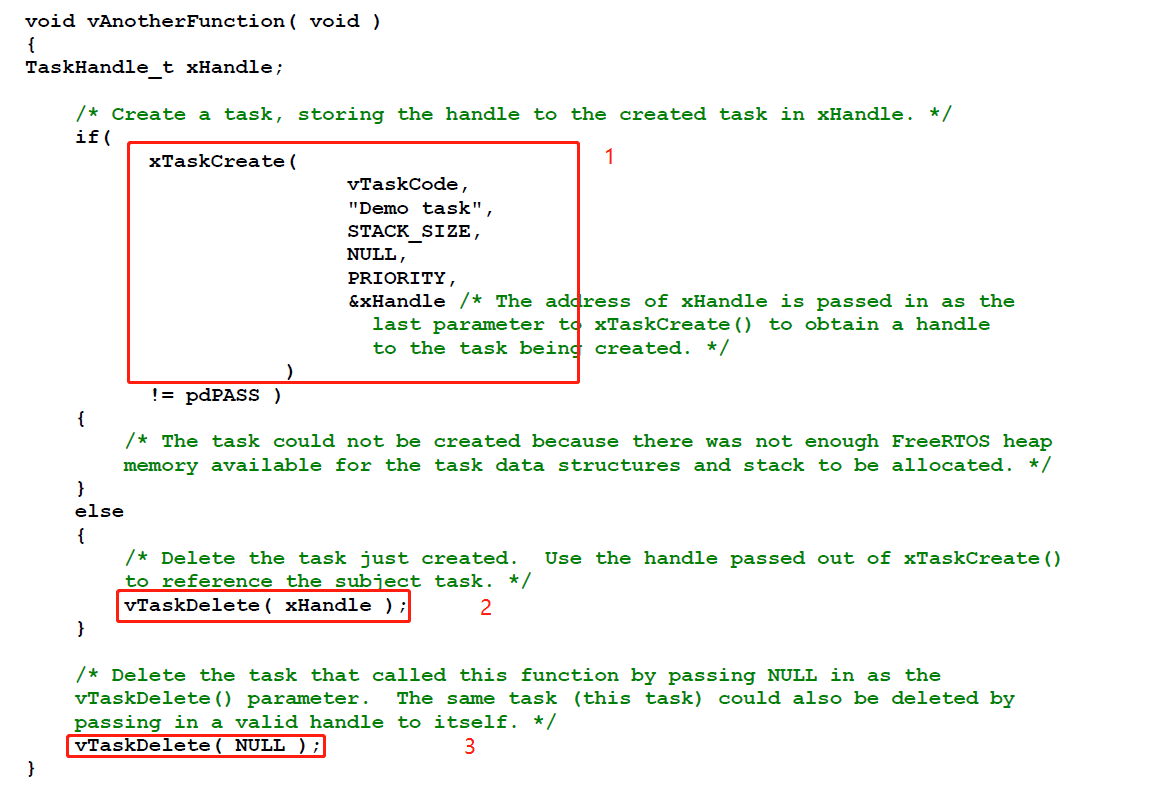 如果任务B创建成功,使用vTaskDelete(任务句柄)删除掉任务B。