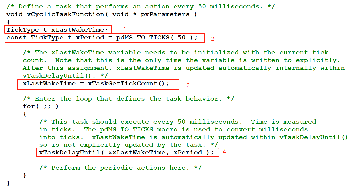 初始化第一步中的变量,在这一步后,这个变量不用再手动更新(vTaskDelayUntil()会更新它)