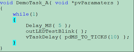在任务A中:vTaskDelay()是从调用的那一刻开始算,那么这个任务本身在Delay_MS中占用了5MS,LED翻转的时间忽略不计,那么加上vTaskDelay()的10MS,就是15MS。