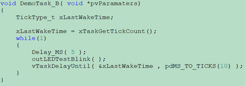 在任务B中:vTaskDelayUntil()和任务本身执行时间无关,只要任务每次循环执行的总时间少于10ms,那么这个任务就是10ms执行一次了。