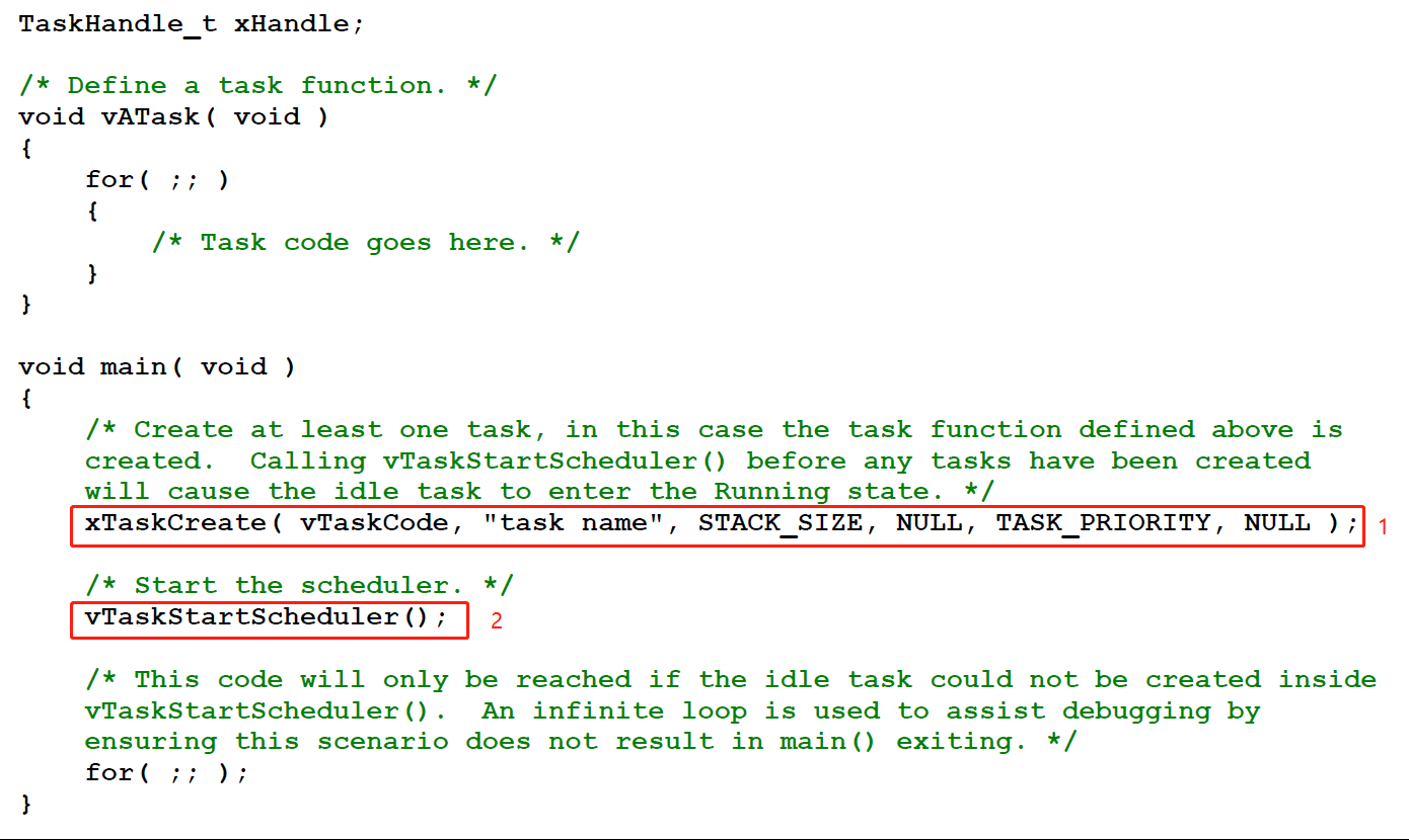这个函数作用是开启调度器,调用这个函数后任务就会开始执行。所以在整个程序中只需要调用一次,一般在main函数中调用就可以了。开启成功的话,系统由调度器接管了,main函数中vTaskStartScheduler()后面的代码都不会被执行。