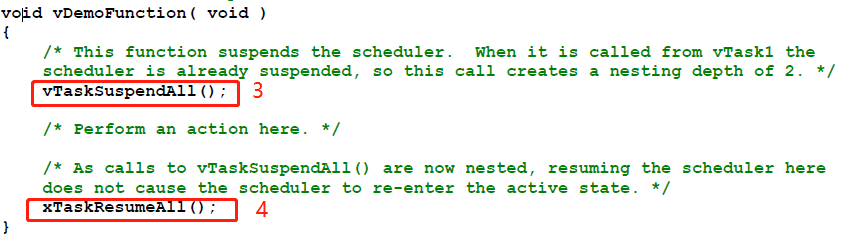 注意:vTaskSuspendAll()是可以递归调用的,这意味着调用了多少次vTaskSuspendAll(),就必须有多少此vTaskResumeAll()的调用才能让调度器恢复。这个情况以下的例子中很好地体现了。