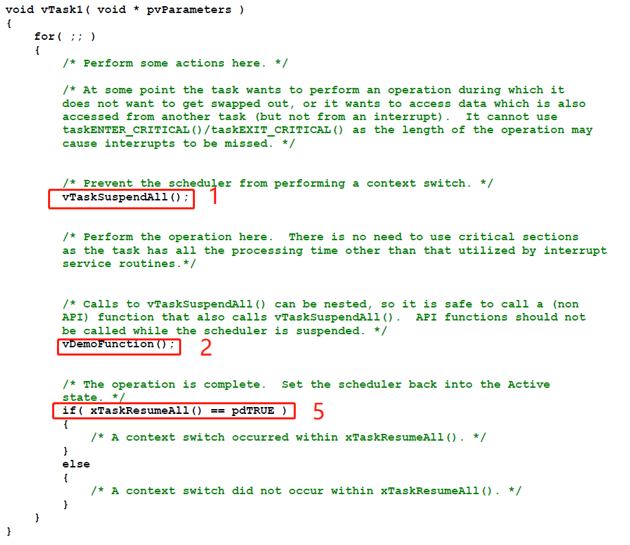 • vTaskSuspendAll()挂起调度器后,只有当前任务在继续执行,不会发生任务切换了。