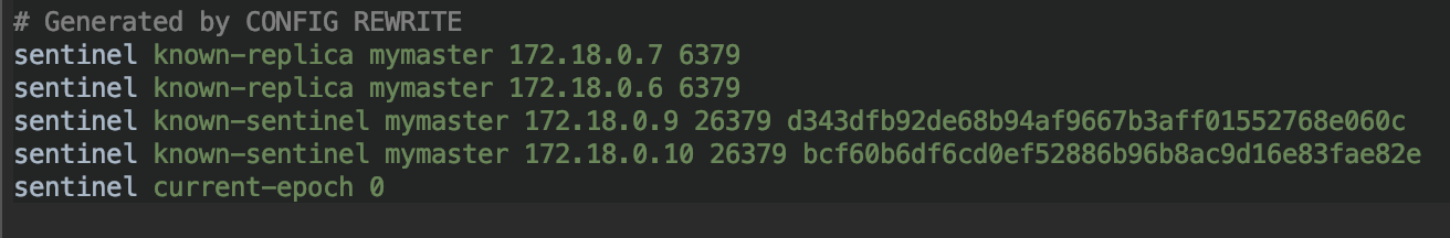我们可看到,已经与master建立连接,通过status=ok可以知道,master正在正常工作,并且有2个从节点和3个哨兵节点。现在你再打开sentinel的配置文件,会发现发生了改变。