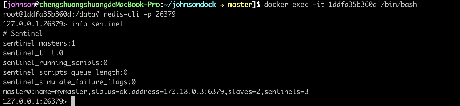 这是我们进入容器,查看是否redis-sentinel是否在工作。