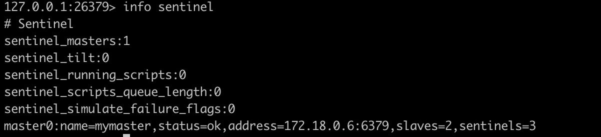 sentinel monitor mymaster redis 6379 2 监听的master的容器别名为redis,端口是6379,最后面的2是当大于等于2个哨兵认为master主观下线后(无论这个值为多少,至少得有一半以上的哨兵判定master主观下线后,master才会被客观下线),master才会被客观下线,这是sentinel重新从slave中选举一个来当master。