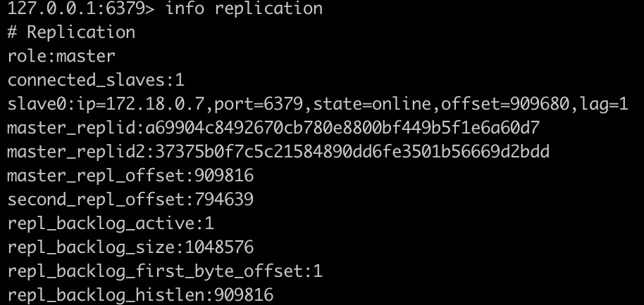 可以用以上docker命令查看容器的IP地址。进入容器后,还是在redis-cli下用info replication查看信息。