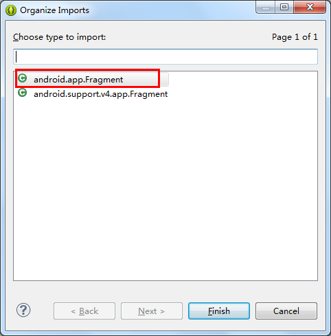 注:上方代码中,因为我们的程序是面对Android 4.0以上版本的,所以导入Fragment的包时,选择第一个:android.app.Fragment