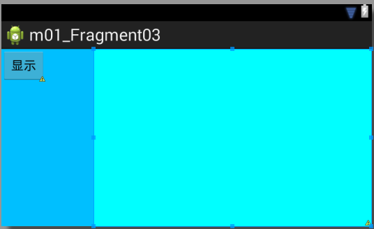 <LinearLayout xmlns:android="http://schemas.android.com/apk/res/android" xmlns:tools="http://schemas.android.com/tools" android:layout_width="match_parent" android:layout_height="match_parent" tools:context=".MainActivity" android:orientation="horizontal" > <LinearLayout android:id="@+id/left" android:layout_width="0dp" android:layout_height="match_parent" android:orientation="vertical" android:layout_weight="1" android:background="#00BFFF" > <Button android:id="@+id/button1" android:layout_width="wrap_content" android:layout_height="wrap_content" android:text="显示"/> </LinearLayout> <LinearLayout android:id="@+id/right" android:layout_width="0dp" android:layout_height="match_parent" android:layout_weight="3" android:background="#00FFFF" android:orientation="vertical" > </LinearLayout> </LinearLayout>