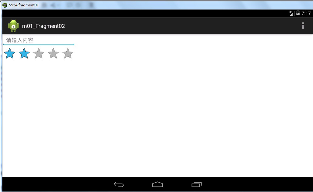 <?xml version="1.0" encoding="utf-8"?> <LinearLayout xmlns:android="http://schemas.android.com/apk/res/android" android:layout_width="match_parent" android:layout_height="match_parent" android:orientation="vertical" > <EditText android:layout_width="match_parent" android:layout_height="wrap_content" android:hint="请输入内容"/> <RatingBar android:id="@+id/ratingBar1" android:layout_width="wrap_content" android:layout_height="wrap_content" /> </LinearLayout>