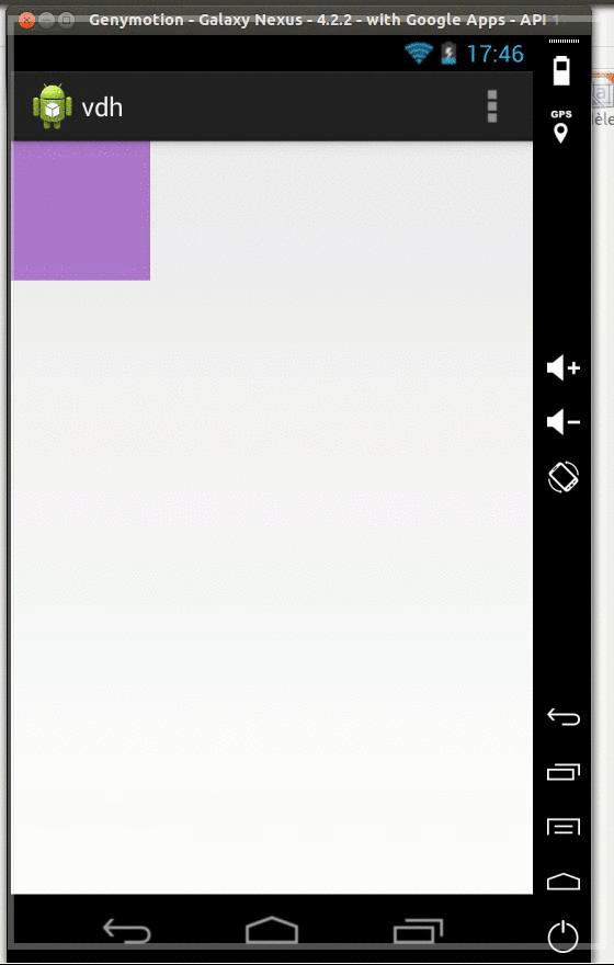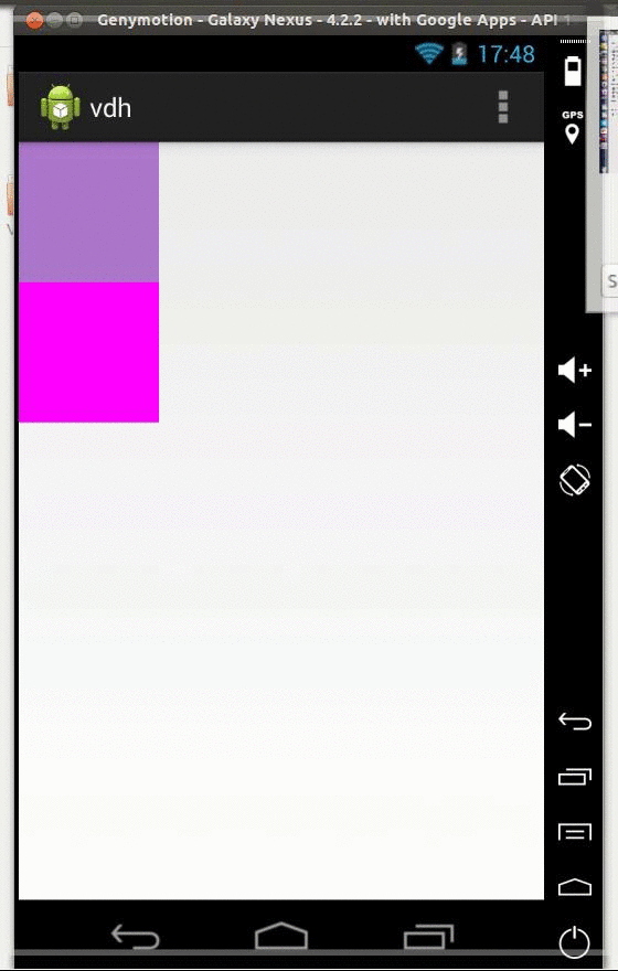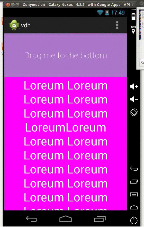 <FrameLayout xmlns:android="http://schemas.android.com/apk/res/android" android:layout_width="match_parent" android:layout_height="match_parent"> <ListView android:id="@+id/listView" android:layout_width="match_parent" android:layout_height="match_parent" android:tag="list" /> <com.example.vdh.YoutubeLayout android:layout_width="match_parent" android:layout_height="match_parent" android:id="@+id/youtubeLayout" android:orientation="vertical" android:visibility="visible"> <TextView android:id="@+id/viewHeader" android:layout_width="match_parent" android:layout_height="128dp" android:fontFamily="sans-serif-thin" android:textSize="25sp" android:tag="text" android:gravity="center" android:textColor="@android:color/white" android:background="#AD78CC"/> <TextView android:id="@+id/viewDesc" android:tag="desc" android:textSize="35sp" android:gravity="center" android:text="Loreum Loreum" android:textColor="@android:color/white" android:layout_width="match_parent" android:layout_height="match_parent" android:background="#FF00FF"/> </com.example.vdh.YoutubeLayout> </FrameLayout>