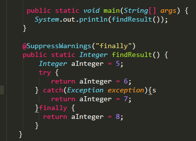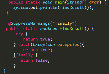 解答:这道题大家需要弄明白finally的使用场景,主要是捕获异常以后必须要执行的代码,大多是关闭流之类的。即使try的代码块已经返回结果但程序仍然会执行finally里面的代码,因此上题返回false。