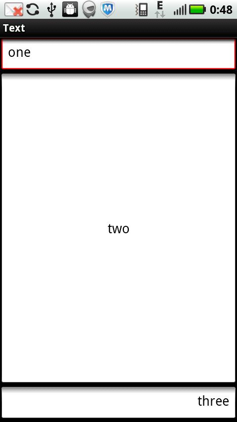 <?xml version="1.0" encoding="utf-8"?> <LinearLayout xmlns:android="http://schemas.android.com/apk/res/android" android:orientation="vertical" android:layout_width="fill_parent" android:layout_height="fill_parent" > <EditText android:layout_width="fill_parent" android:layout_height="wrap_content" android:gravity="left" android:text="one"/> <EditText android:layout_width="fill_parent" android:layout_height="wrap_content" android:gravity="center" android:layout_weight="1.0" android:text="two"/> <EditText android:layout_width="fill_parent" android:layout_height="wrap_content" android:gravity="right" android:text="three"/> </LinearLayout>