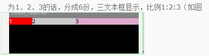 <?xml version="1.0" encoding="UTF-8"?> <LinearLayout xmlns:android="http://schemas.android.com/apk/res/android" android:layout_width="fill_parent" android:layout_height="wrap_content" android:orientation="horizontal" > <TextView android:background="#ff0000" android:layout_width="**" android:layout_height="wrap_content" android:text="1" android:textColor="@android:color/white" android:layout_weight="1"/> <TextView android:background="#cccccc" android:layout_width="**" android:layout_height="wrap_content" android:text="2" android:textColor="@android:color/black" android:layout_weight="2" /> <TextView android:background="#ddaacc" android:layout_width="**" android:layout_height="wrap_content" android:text="3" android:textColor="@android:color/black" android:layout_weight="3" /> </LinearLayout>