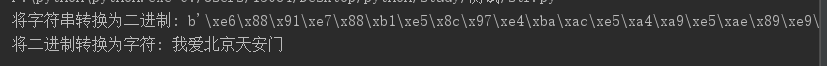 name1="我爱北京天安门"print("将字符串转换为二进制:",name1.encode(encoding="utf-8"))print("将二进制转换为字符:",name1.encode(encoding="utf-8").decode(encoding='utf-8'))
