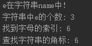 print("e在字符串name中!") print("字符串中e的个数:", name.count("e")) print("找到字母的索引:", name.find("e")) #find()从左向右寻找子序列的位置,如存在多个相同子序列只返回第一个查找到的位置,如果子序列不存在返回-1