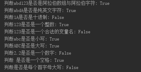name="my name is leBron james"print("判断abd123是否是阿拉伯数组与阿拉伯字符:","abd123".isalnum())print("判断abdA是否是纯英文字符:","abdA".isalpha())print("判断1A是否是十进制:","1A".isdecimal())print("判断123是否是一个整数:","123".isdigit())print("判断123是否是一个合法的变量名:","123 ".isidentifier())print("判断abc是否是小写:","abc".islower())print("判断ABC是否是大写:","ABC".isupper())print("判断2.2是否是一个数字:","2.2".isnumeric()) #除数字外其他字符都算falseprint("判断 是否是一个空格:"," ".isspace())print("判断是否是每个首字母大写:",name.istitle())5.字符串的特定情况下输出
