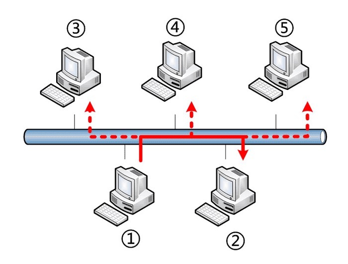 上图中,1号计算机向2号计算机发送一个数据包,局域网内其他的计算机都会收到这个包.他们读取数据包的报头,找到接收方得MAC 地址,然后与自身的MAC 地址相比较,如果两者相同,就接收这个包,做进一步的处理,不相同的话就丢弃这个数据包.这种发送方式叫'广播'.
