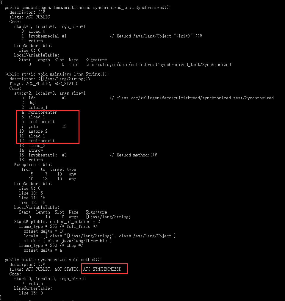 大致可以看出,对于上述代码中的同步块 的实现是通过monitorenter和monitorexit 指令,而同步方法是依靠方法修饰符上的ACC_SYNCHRONIZED 来完成的。
